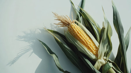 High-angle shot of a yellow corn cob with lush green husks, isolated on a white background.