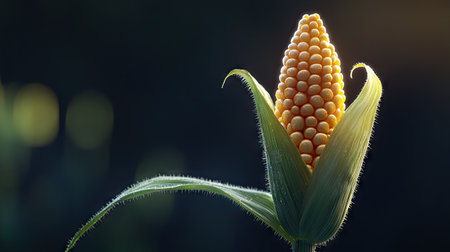 Young corn cob with green husk peeled back, exposing the golden kernels, on a dark background for a striking contrast. --chaos