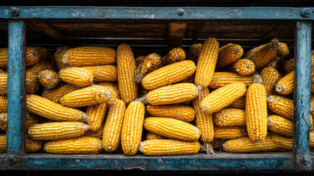 Harvested corn cobs in a metal trailer awaiting transport from the field