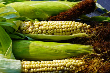 Set of fresh peeled sweet corn before cooking.