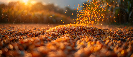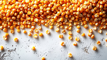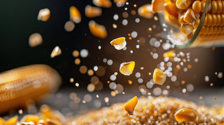 Stunning close-up capturing vibrant yellow corn kernels in motion, showcasing their texture against a softly blurred background, perfect for food and agriculture themes.