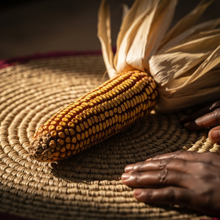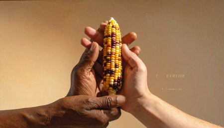 In a gesture of unity and shared heritage, two hands from different backgrounds come together to hold a single, vibrant ear of corn.