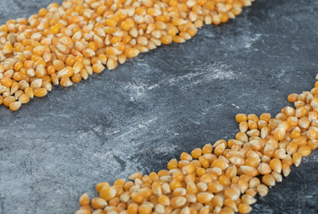 Sweet uncooked popcorn seeds on a marble background