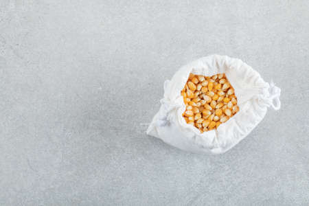 A white sack full of corn grains on a gray background