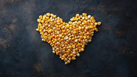 Top view of corn kernels arranged in a heart shape on a textured dark background, symbolizing healthy eating.