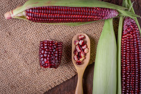 Close up of purple corn kernels on a corn cob, food background