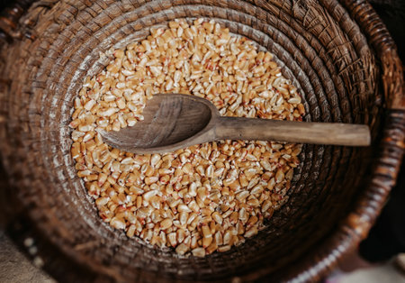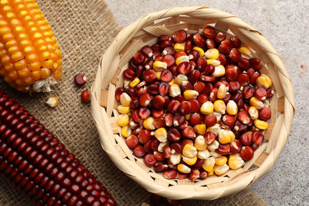 Corn seeds in wickerwork basket