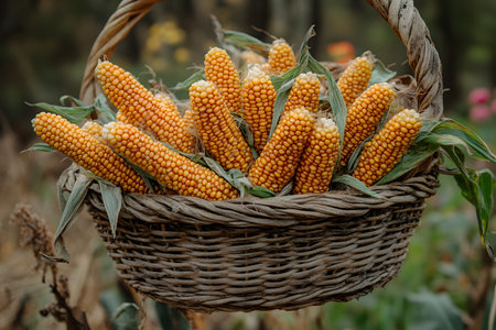 A bountiful basket of vibrant corn cobs nestled in an autumnal outdoor setting. the woven basket enhances the natural beauty, making it ideal for seasonal designs, agricultural themes, or fall harvest celebrations. Generative AI