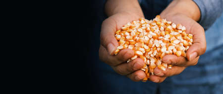yellow ripe corn grain in woman farmer hand with dark background for copy space banner, industrial agriculture concept