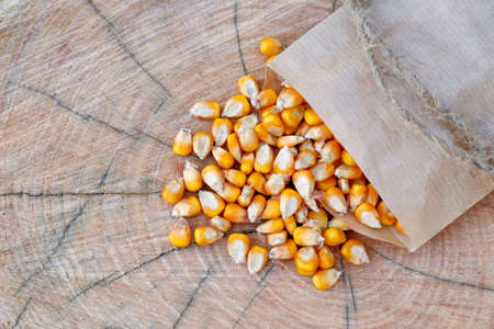 Paper bag with corn seeds on wooden background, top view. vegetable planting