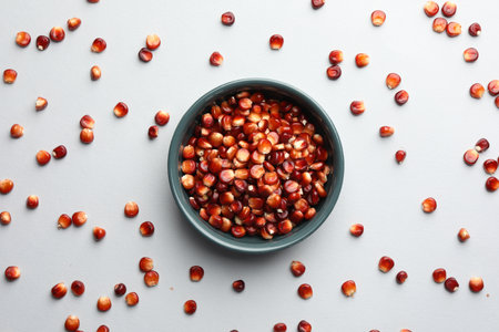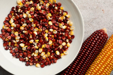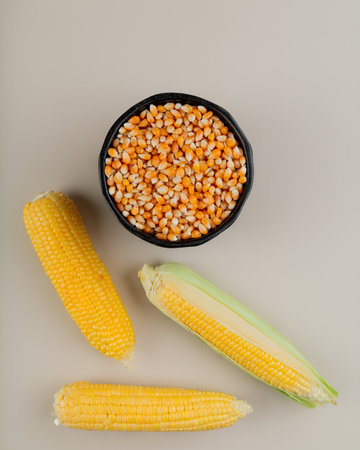 outh indian style boiled corn and unpopped popcorn grains are isolated on grey background. Top view,Side view Daylight.