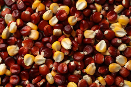 Kernels of red and yellow corn as background, top view