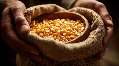 Up close, a person's hands hold a wooden bowl filled with vibrant yellow corn kernels, nestled inside a burlap sack, showcasing harvest and agricultural bounty.