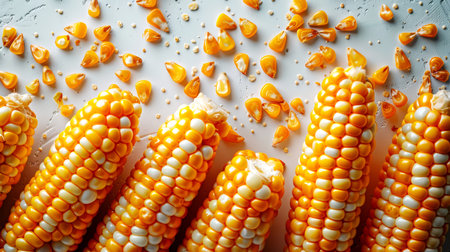 A close-up of an exploding corn cob and yellowish corn kernels flying in different directions. Corn is scattered all over the image. The scene is chaotic and disorganized. An ingredient for salads