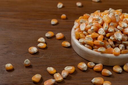 Corn seeds, grain corn in wooden dish on wooden table.