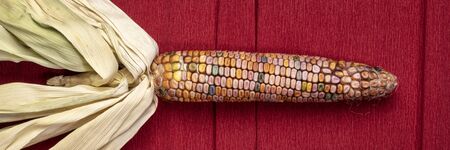 ornamental corn ear against textured red crepe paper, long banner, fall holiday or harvest concept