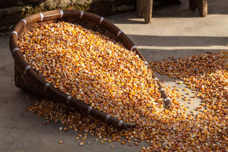 Corn in basket being dried on the ground