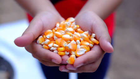 Close-up yellow dried corn for background, dried corn for popcorn of animal feed. Farmer holding corn grains in his hands