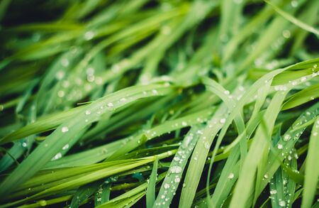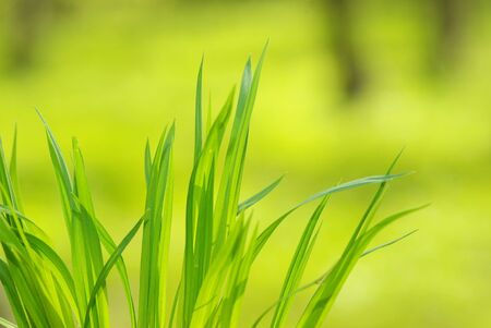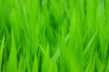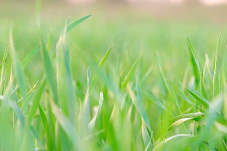Creative background image of blurry green blades of grass. Copy space. Selective focus