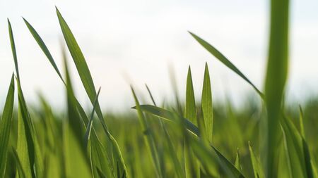 Macro shot of bright green grass sprouts in spring. Green meadow of closeup fresh grass.