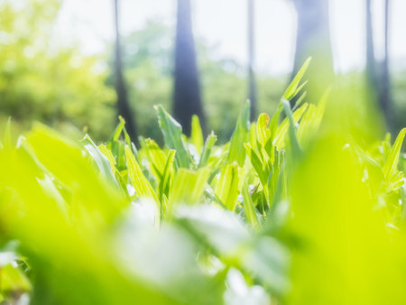 Close-up view of vibrant green grass blades bathed in sunlight. A serene and peaceful image of nature's beauty
