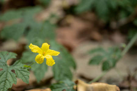 Bitter melon flower. Bitter gourd flowers in the garden. Melon flower yellow color with green leaves in organic plant garden.