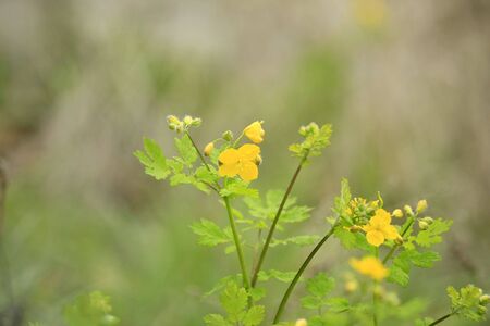 Greater Celandine, yellow wild flowers, close up. Chelidonium majus is poisonous, flowering, medicinal plant of the family Papaveraceae. Yellow-orange opaque sap of Tetterwort plant cures warts.