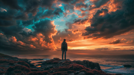 Man standing on a rock looking at the sunset over the ocean.
