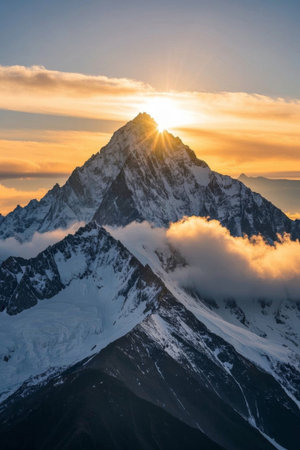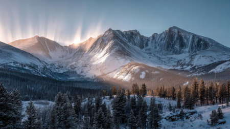 This breathtaking winter landscape features a snow-covered mountain range illuminated by soft sunlight and stunning rays. The tranquil scene captures the beauty of nature, making it perfect for travel and adventure themes.