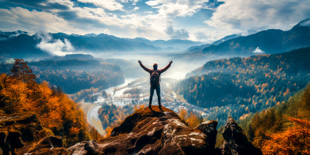 A figure stands on a mountain peak with arms open, celebrating a breakthrough moment as sunlight floods the landscape during sunset.