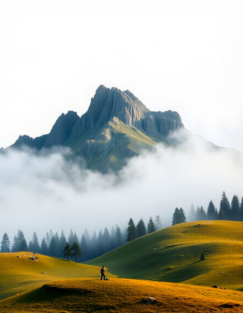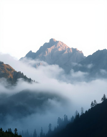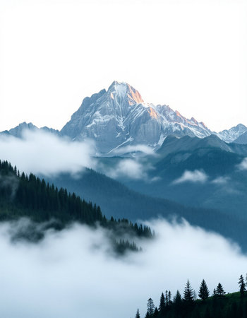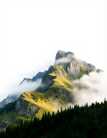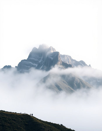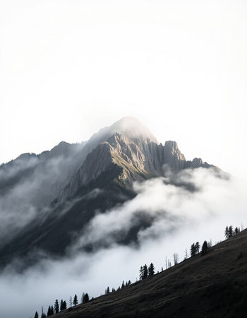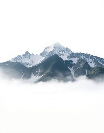 mountain peak in the clouds on a white background, nature series
