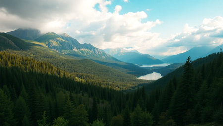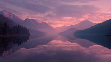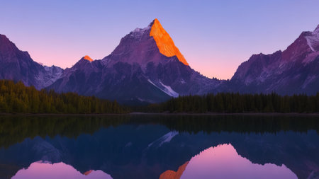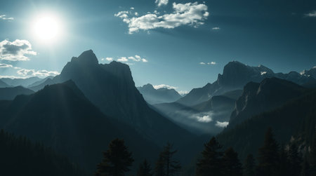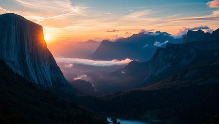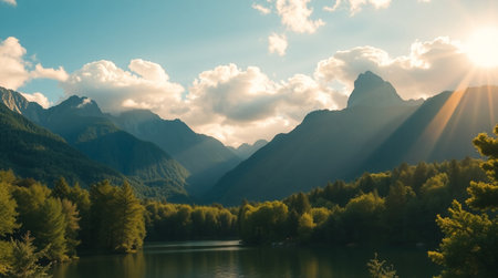 Golden rays of sunlight filter through mountain peaks at sunrise, casting a serene glow over the tranquil landscape, enhancing the natural beauty.