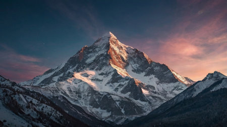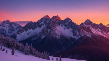 Mountain landscape with snowcapped peaks at sunset, Switzerland.