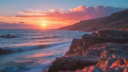 AI Generated. Dramatic Sunset over Rocky Coastal Landscape