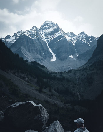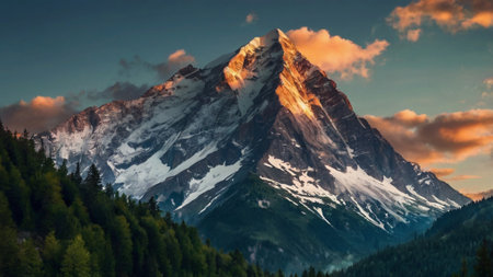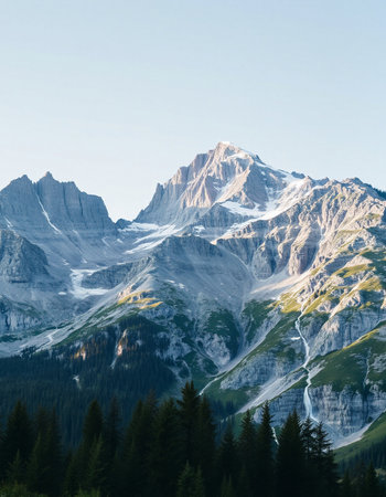 Mountain landscape with coniferous forest and snow-capped peaks