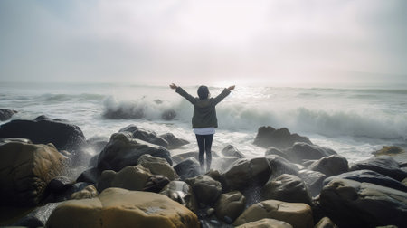 Young woman standing on the rocks at the beach in a foggy day