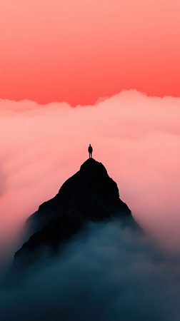 A solitary figure stands atop a mountain peak, surrounded by a sea of clouds under a vibrant sunset sky.