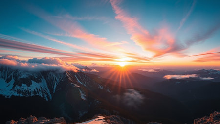 Mountain panorama at sunset with clouds and sun in the sky