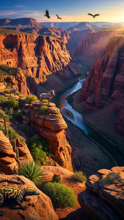 A serene canyon landscape with a winding river at sunset