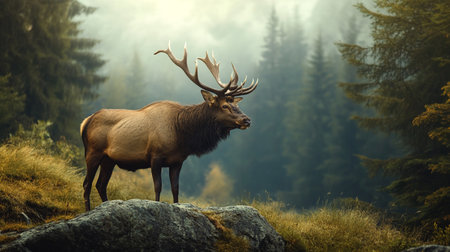 A majestic stag stands proudly in a misty forest, capturing the serene beauty of nature. This stunning wildlife portrait highlights the wonder of the animal world.
