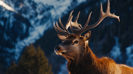 A majestic deer stands in a mountain landscape at sunset, with warm light highlighting its silhouette, symbolizing nature's beauty and grace.