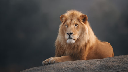 This captivating image features a majestic lion resting on a rock, showcasing its magnificent mane and serene expression in a natural wildlife setting.