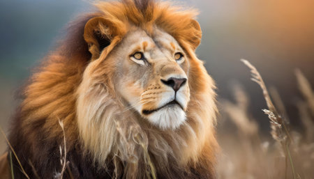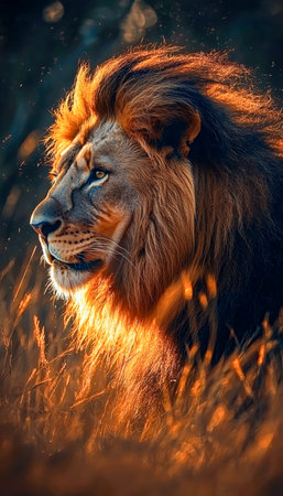 Close-up of a majestic male lion, its mane bathed in the warm glow of a setting sun. A lion with a long mane and a golden face stands in a field of tall grass