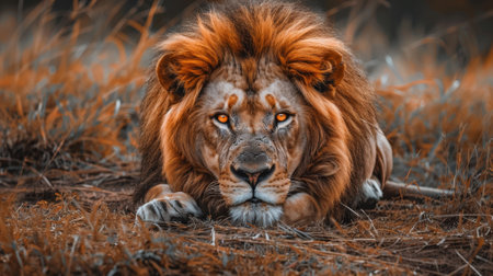Majestic male lion in savannah at sunset, symbolizing the king of the wild in its natural habitat