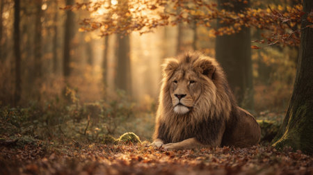Golden sunlight filters through the trees illuminating a lion lying quietly on the forest floor surrounded by vibrant autumn leaves. A tranquil moment in nature.