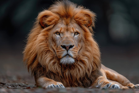 A close-up shot of a lion with a detailed view of its face, fur, and piercing eyes against a dark background, showing the animal's majesty and strength in the animal kingdom, perfectly captured in stunning detail.