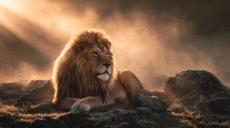 A stunning portrait of a lion on a misty grassland at dawn, embodying the majesty and serenity of wildlife in its natural habitat. Perfect for nature enthusiasts.