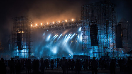 Vibrant festival scene showcasing a stage illuminated by colorful lights and fog, with a captivated crowd enjoying the lively performance under an enchanting night sky.