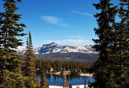 Photo of a mountain in front of a lake, surrounded by pine trees, morning atmosphere