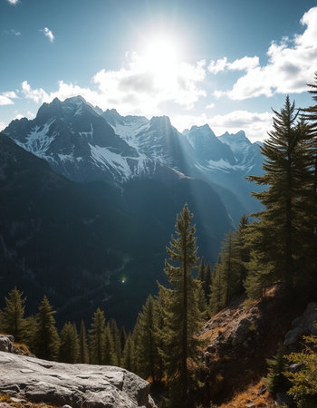 The brilliant sun is shining brightly through the fluffy clouds that are gracefully drifting over the majestic mountains in the distance